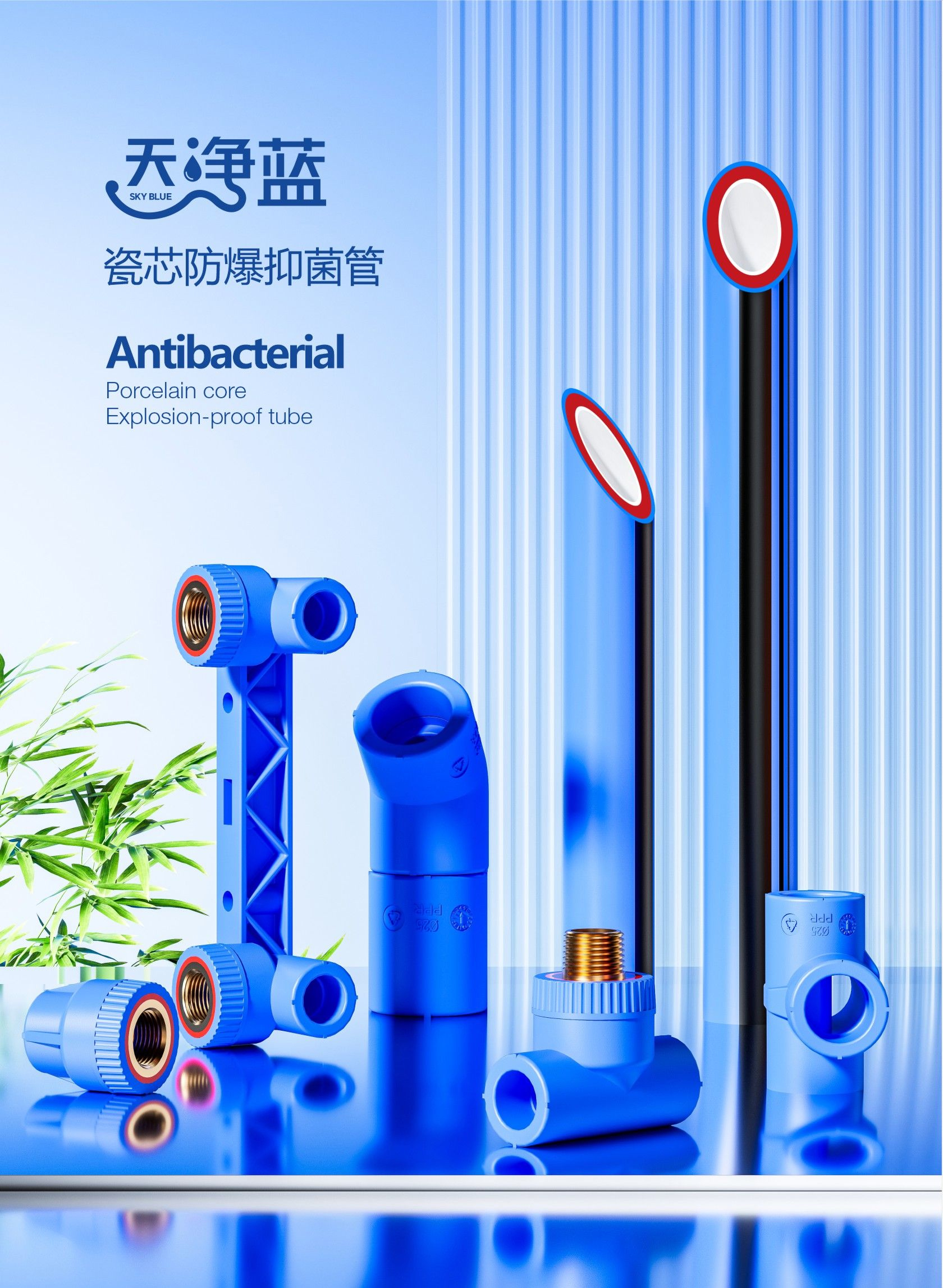 融合天净蓝清新色彩与先进科技。瓷芯层有效抑圆,守护水质健康;防规设计增强抗压性,使用更安心;PP-R材质环保耐用,三层结构完美融合,为您打造安全、健康、舒适的用水环境。产品耐腐蚀、耐高温,持久耐用,全方位守护您的用水健康与安全,是现代家居装修的理想选择。
